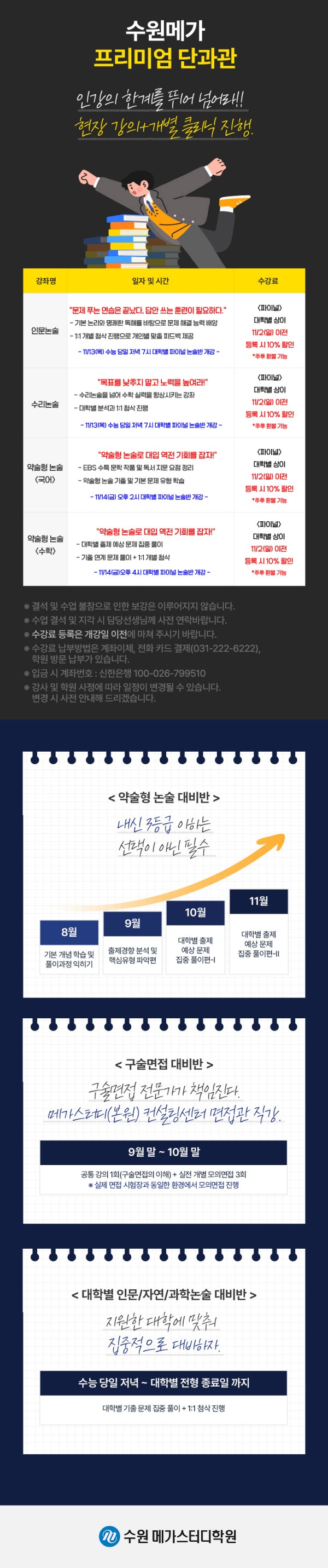 2025 파이널 대학별 논술 프로그램(인문/수리/약술형 논술) 페이지 정보 작성자 최고관리자 작성일 22-11-26 11:12 조회 4,308회 댓글 0건 본문 2025 파이널 대학별 논술 프로그램(인문/수리/약술형 논술)